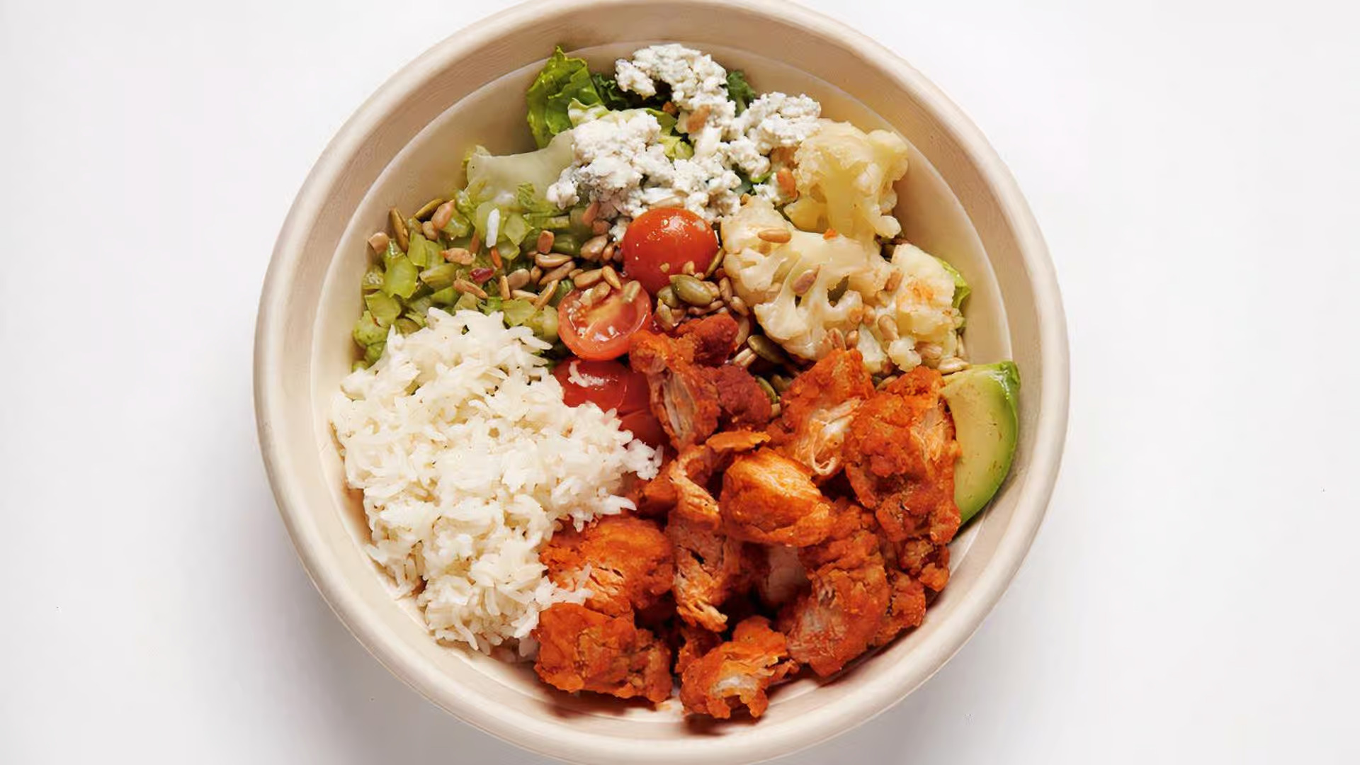 Fried chicken tenders, avocado, roasted cauliflower, celery, marinated cherry tomatoes, seed blend, blue cheese crumbles, Frank's Hot Sauce, your choice of grains with our greens blend and BBQ Ranch (served on side).