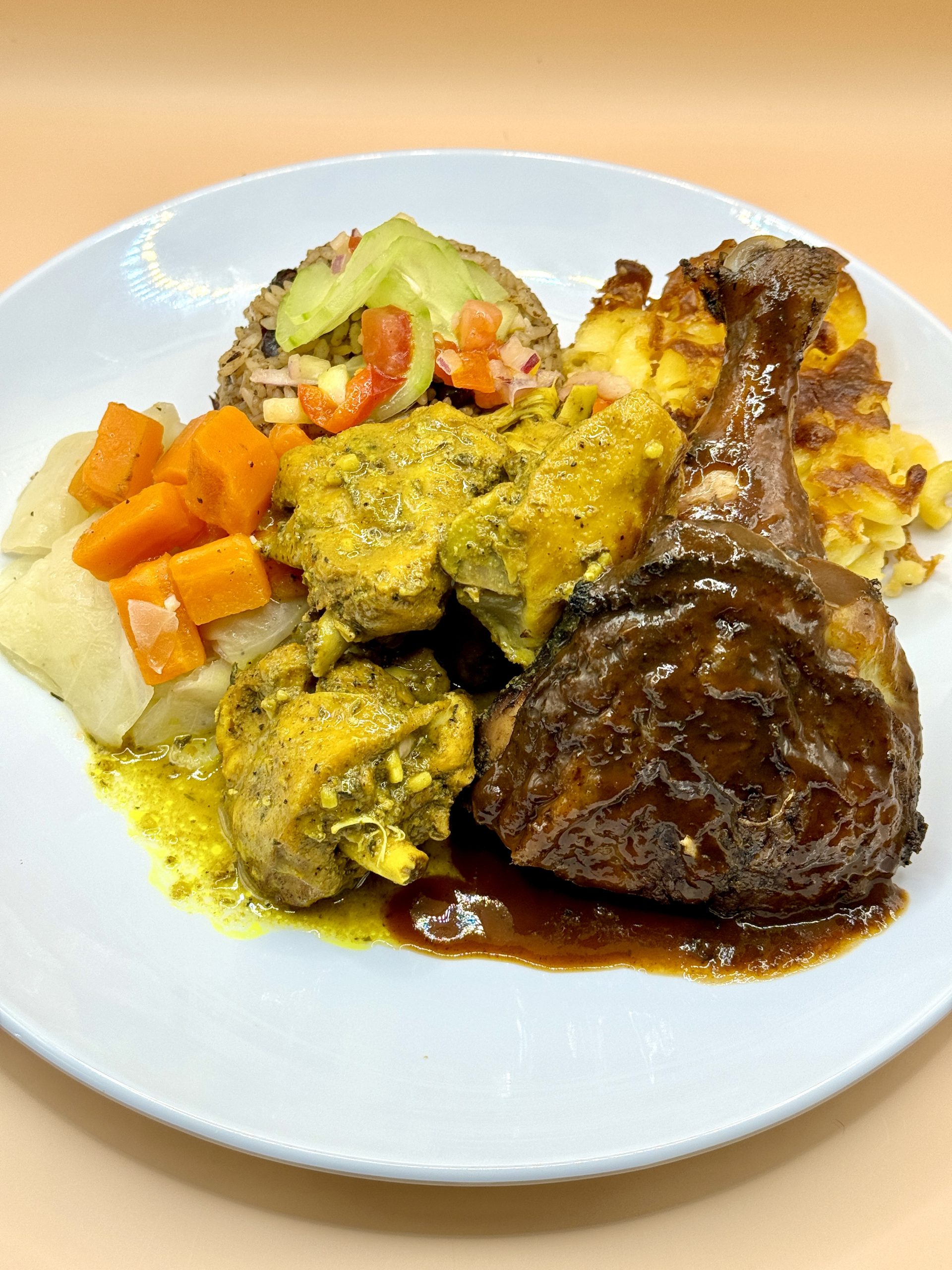 Treat yourself to a delightful combination by selecting two irresistible chicken options: aromatic curry, hearty brown stew, or zesty jerk chicken. Each meal is paired with your choice of fluffy white rice or savory rice and peas, complemented by two delectable sides. Don’t miss out on this culinary experience!