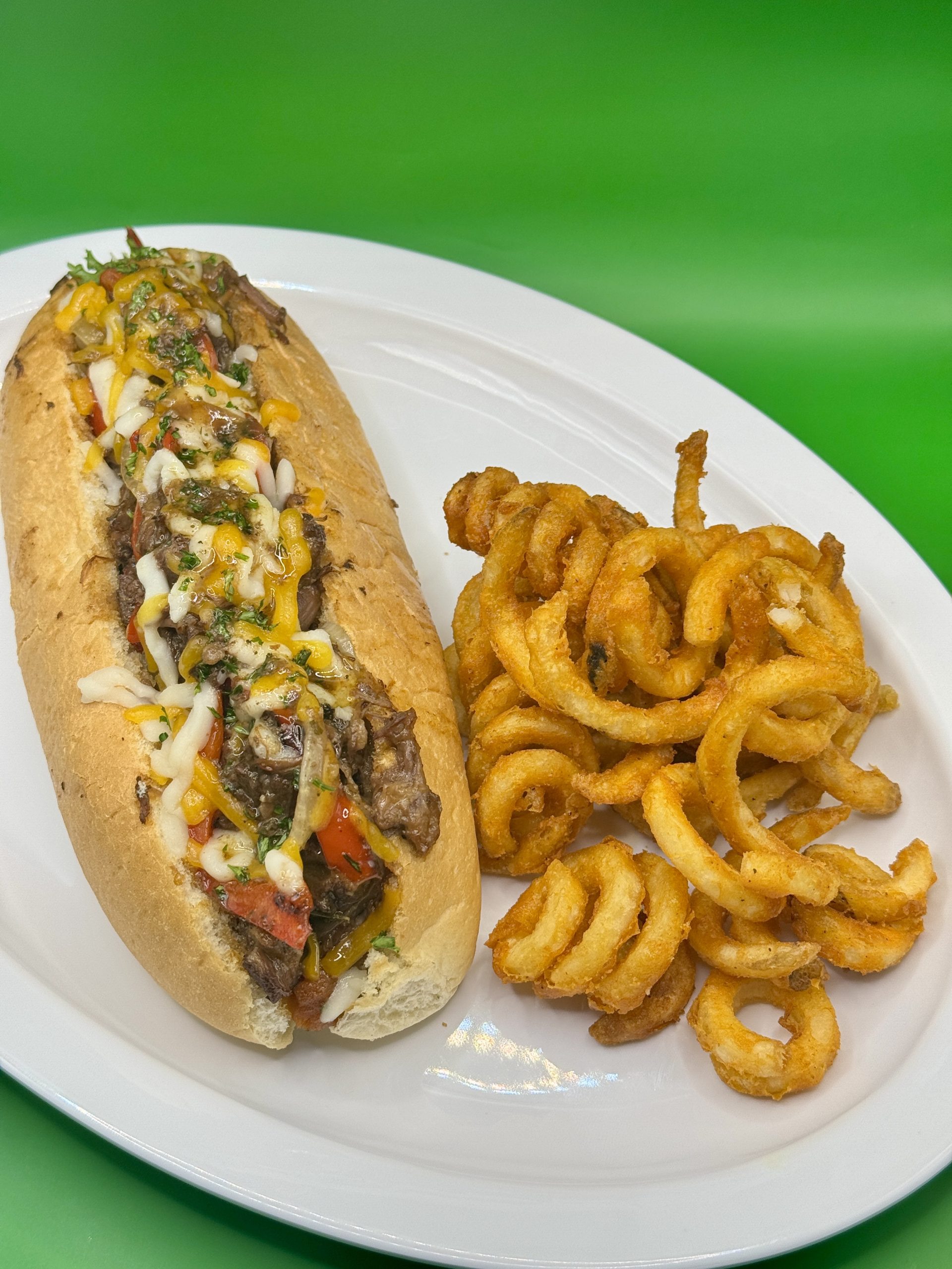 Slow cooked oxtail piled on a toasted hoagie roll with melted cheese, sauteed peppers served with a side of crispy fries.