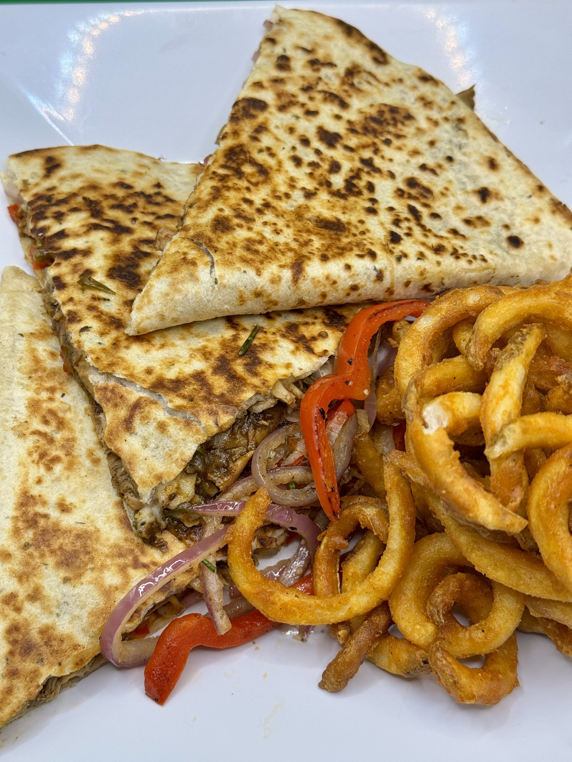 Melted cheese encased in a crispy tortilla, with your choice of succulent shrimp, spicy jerk chicken, grilled chicken, or tender oxtail, creating a symphony of flavors in every bite.